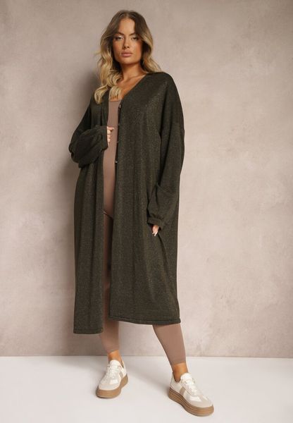 Zielony Kardigan z Wiskozą o Długim Kroju Zapinany na Guziki z Metaliczną NIcią Arkaria