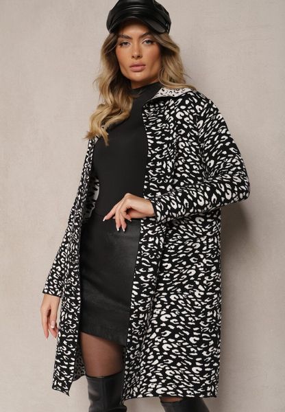 Czarno-Biały Niezapinany Kardigan z Kieszeniami w Panterkowy Print Riaverna