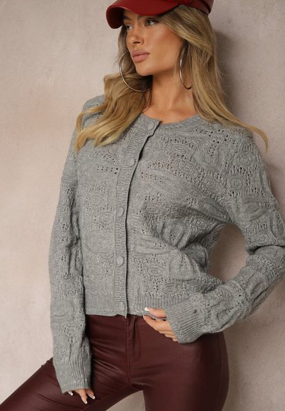 Szary Pudełkowy Kardigan z Wełną i Wiskozą o Tłoczonym Splocie Vaitra