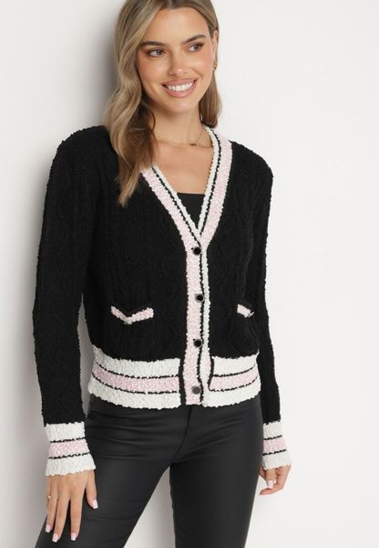Czarny Krótki Rozpinany Kardigan z Wiskozą Paskami i Ozdobnymi Guzikami Lialana