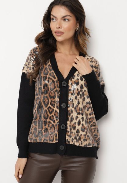 Czarno-Beżowy Kardigan z Wiskozą z Panterkowymi Wstawkami z Przezroczystymi Cekinami Attenia