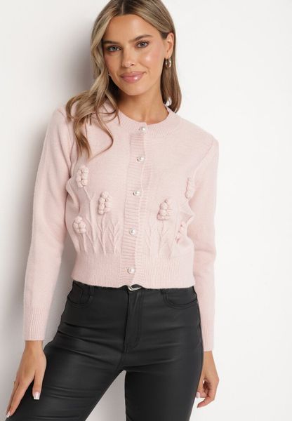 Różowy Rozpinany Kardigan z Wiskozy z Kuleczkami Perełkami i Tłoczeniem Pokryty Brokatem Haririda