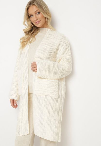Jasnobeżowy Niezapinany Kardigan o Luźnym Splocie ze Wsuwanymi Kieszeniami Inariella