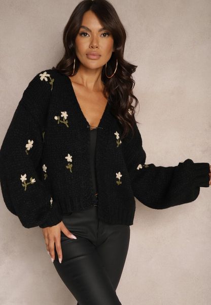 Czarny Kardigan w Kwiatowe Aplikacje z Zapięciem na Elegancką Agrafkę Patista