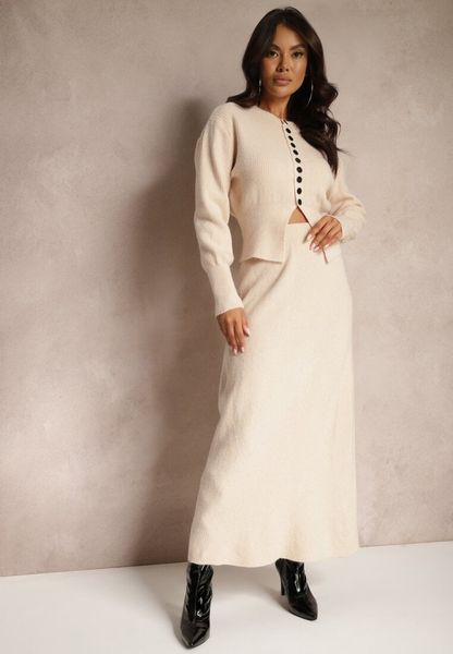 Jasnobeżowy Komplet z Dzianiny z Wełną Kardigan z Guzikami i Spódnica z Gumką w Talii Melzina