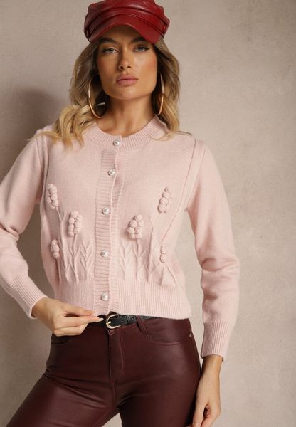Różowy Wiskozowy Kardigan z Guzikami Perełkami Brokatem Tłoczeniem i Kuleczkami Harirani