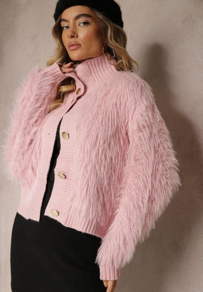 Jasnofioletowy Kardigan z Wełną Zapinany na Ozdobne Guziki ze Stójką i Puszystą Fakturą Zinavia