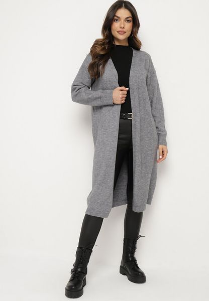 Szary Klasyczny Długi Kardigan Niezapinany z Wełną Zozila