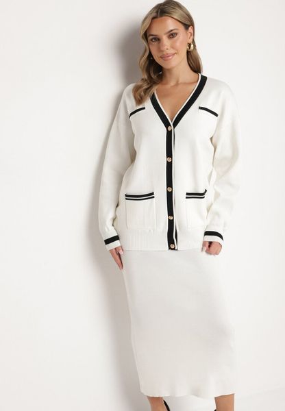Biały Komplet z Wiskozy Dopasowana Spódnica Rozpinany Kardigan z Lamówką Tamaira