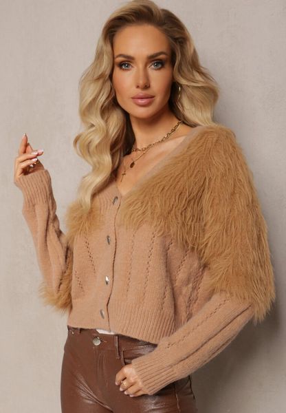 Brązowy Kardigan z Włochatą Dzianiną Przy Dekolcie i Rękawach Saccina
