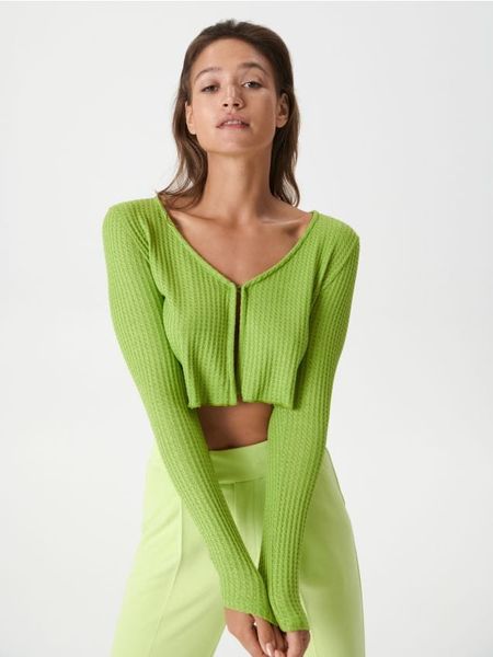 Krótki kardigan uszyty ze strukturalnej dzianiny.