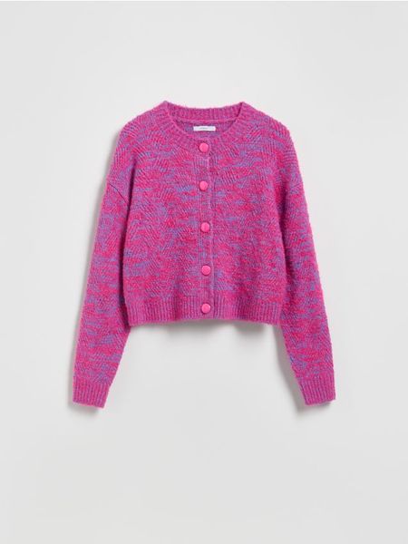 Kardigan o prostym kroju, wykonany z dzianiny z domieszką wełny.