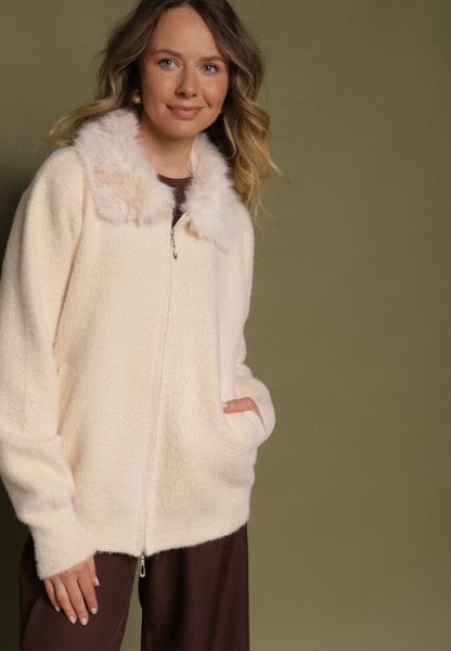 Beżowy Kardigan z Wełną z Futrzanym Kołnierzem Zapinany na Suwak Sistte