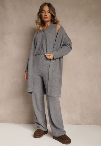 Szary Komplet z Dzianiny z Wełną Długi Kardigan Spodnie i Kamizelka Otizane