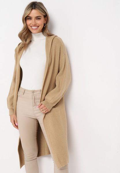 Beżowy Niezapinany Kardigan z Kapturem i Kieszeniami Elicon