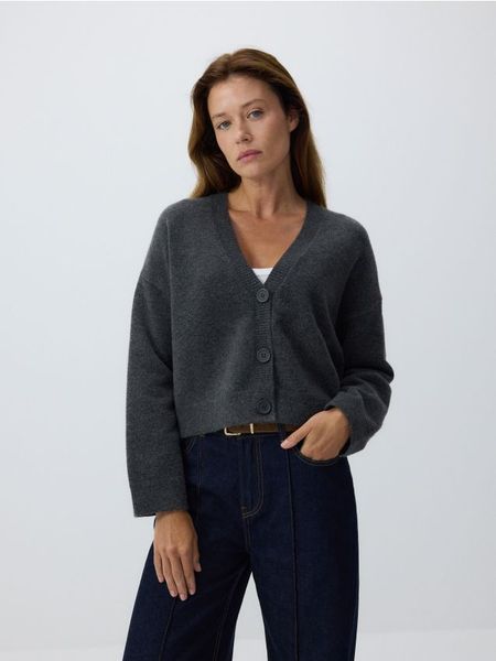 Kardigan o krótszym kroju, wykonany z dzianiny z domieszką wełny.
