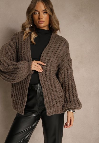 Brązowy Oversizowy Kardigan Bez Zapięć z Dodatkiem Wełny i Wiskozy Titanesa