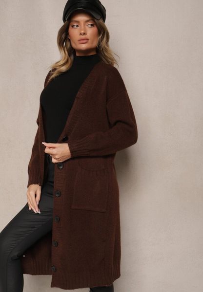 Brązowy Casualowy Kardigan na Guziki z Wełną i Bawełną o Długim Kroju Vamini