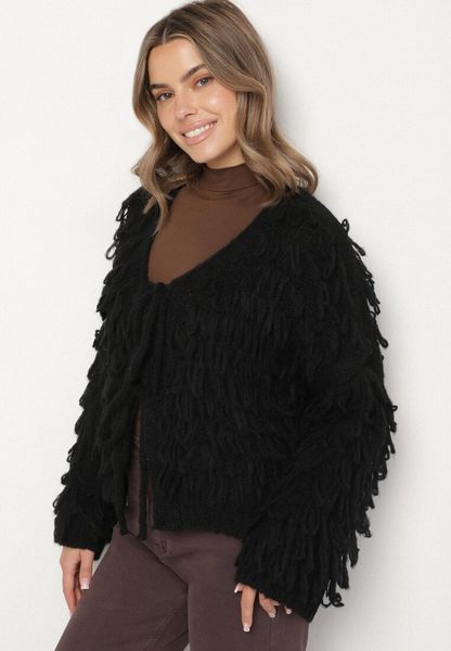 Czarny Wiązany Kardigan z Dodatkiem Wełny i Wiskozy Zdobiony Frędzlami Tiravea