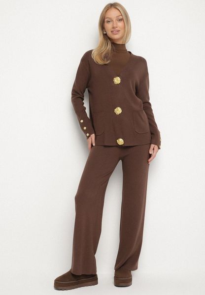 Brązowy Komplet Dzianinowy z Wiskozą Kardigan i Szerokie Spodnie Badire