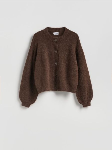 Kardigan o prostym kroju, wykonany z dzianiny z dodatkiem wełny i moheru.