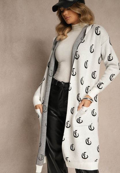 Jasnoszary Kardigan z Kapturem Ozdobiony Geometrycznym Motywem Ralanessa