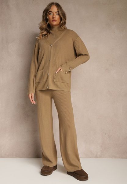 Beżowy Komplet z Dzianiny z Bawełną Spodnie Kardigan i T-shirt z Golfem Ralonia