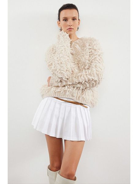 – dekolt: okrągły- zapięcie: listwa guzikowa- ściągacz: dekolt, zakończenia rękawów, dolny brzeg- detale: frędzle- krój: luźny- wzór splotu: luźny