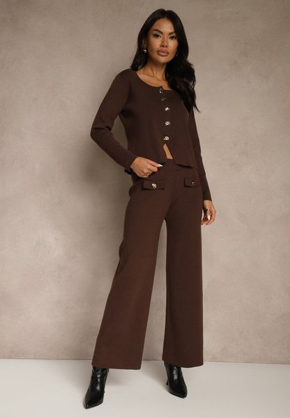 Brązowy Elegancki Komplet z Dzianiny z Wiskozą Kardigan i Spodnie Delinavea