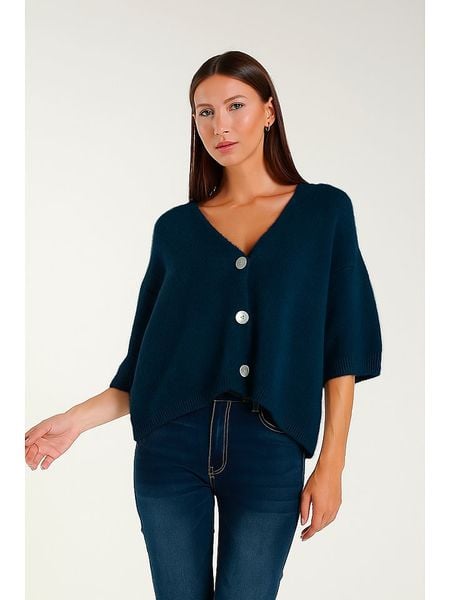 – z dodatkiem wełny- dekolt: V- zapięcie: listwa guzikowa- długość rękawa: 3/4- ściągacz: zakończenia rękawów, dolny brzeg- krój: luźny- look: jednokolorowy