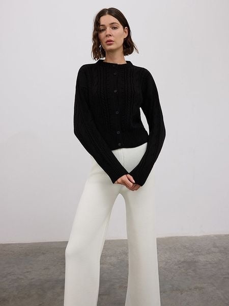 – z dodatkiem wełny – dekolt: okrągły – zapięcie: listwa guzikowa – ściągacz: dekolt, zakończenia rękawów, dolny brzeg – wzór splotu: warkocz- krój: prosty – look: jednokolorowy Uwaga: Przy wyborze właściwego wariantu zaleca się korzystanie z tabeli rozmiarów.