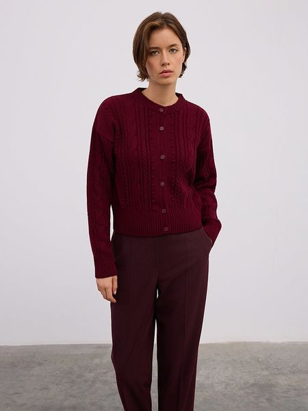 – z dodatkiem wełny- dekolt: okrągły- zapięcie: listwa guzikowa- ściągacz: dekolt, zakończenia rękawów, dolny brzeg- wzór splotu: warkocz- krój: prosty- look: jednokolorowyUwaga: Przy wyborze właściwego wariantu zaleca się korzystanie z tabeli rozmiarów.