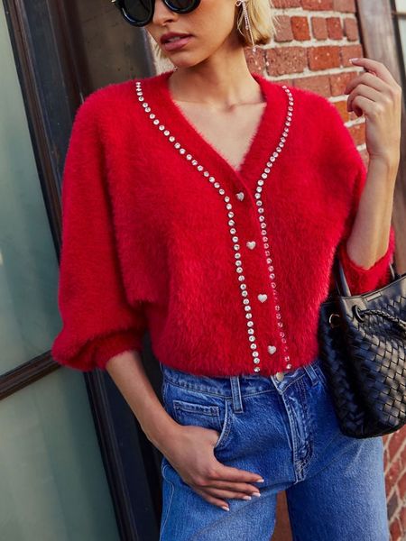 – dekolt: V- zapięcie: listwa guzikowa- ściągacz: dekolt, zakończenia rękawów, dolny brzeg- detale: błyszczące kamyczki- krój: luźny- look: jednokolorowy