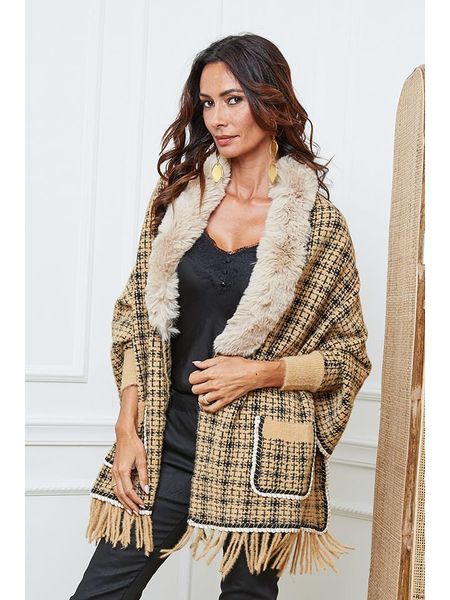 – zapięcie: bez- kieszenie: naszyte- wstawka ze sztucznego futerka: tak- ściągacz: zakończenia rękawów- detale: frędzle- krój: luźny- wzór: kratka- wzór splotu: luźny