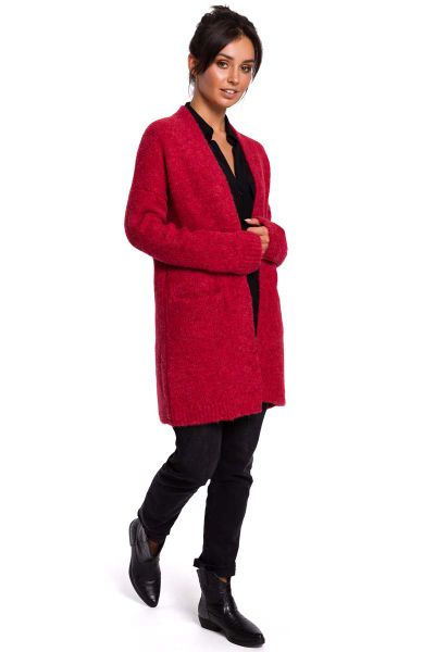 Malinowy Minimalistyczny Ciepły Kardigan z Kieszeniami