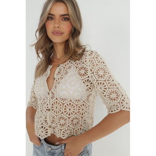 Kardigan Rosia w całości wykonany z bawełny w ażurowym stylu. Krótki fason zapinany na guziki z wycięciami. Rękaw o długości 3/4. Okrągły dekolt. Ażurowy kardigan w stylu boho to idealny dodatek do plażowej stylizacji lub do koronkowego topu i spódnicy mini.