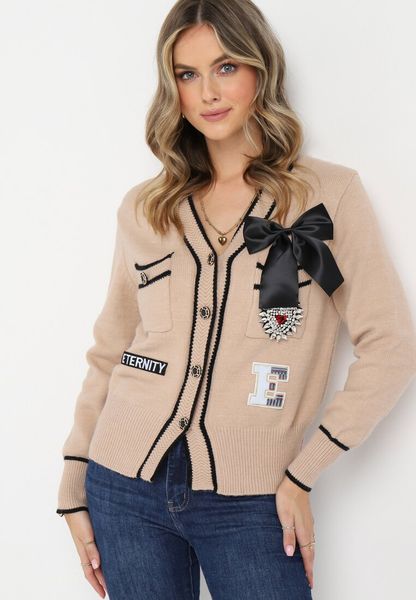 Kardigan Evalo zapinany na guziki, ozdobiony naszywkami z cekinami i cyrkoniami, dodatkowo broszka w kształcie kokardki.