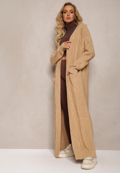 Beżowy Kardigan o Wydłużonym Fasonie Niezapinany ze Splotem w Warkocz Ottimia