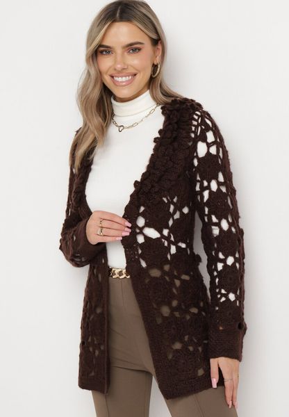 Ciemnobrązowy Kardigan z Ażurowym Zdobieniem i Wiązanym Paskiem Sabelia
