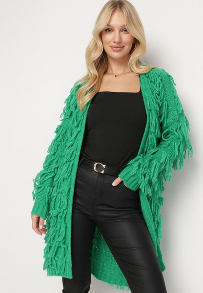 Zielony Luźny Kardigan Niezapinany w Ozdobne Frędzle Tadesse