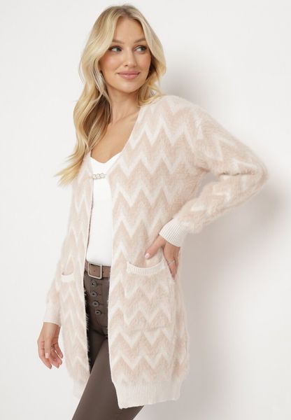 Kardigan Afesura niezapinany o przedłużonym fasonie. Długie rękawy i dół zakończone ściągaczem. Na wysokości bioder wsuwane kieszenie. Wykonany z delikatnej dzianiny z długim włosem w zygzaki chevron.