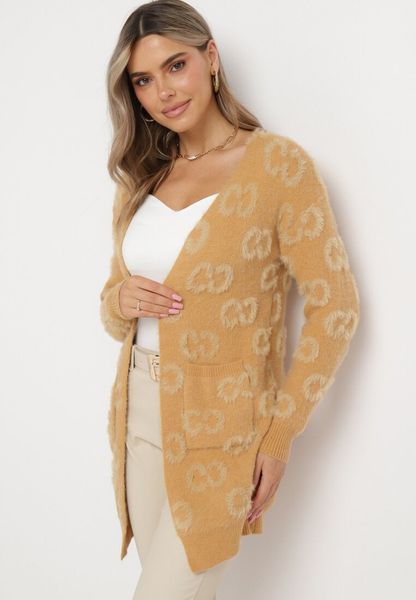 Ciemnobeżowy Niezapinany Kardigan w Cętki z Dłuższym Włosiem Weatha