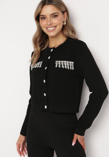 Czarny Kardigan z Guzikami w Kształcie Kwiatka z Cyrkoniami i Frędzlami Wileara