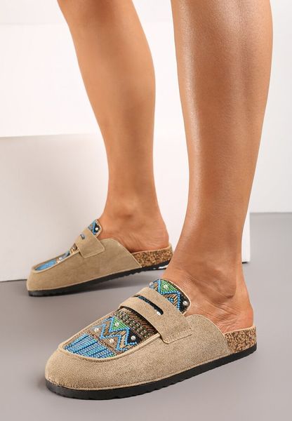 Ciemnobeżowe Płaskie Klapki z Ekozamszu Zdobione Cyrkoniami i Koralikami Allina