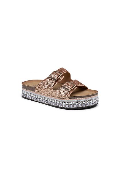 – zapięcie: sprzączka- noski: otwarte- powierzchnia: błyszcząca- detale: plecionka, ozdobne nity- forma obcasa: platforma- podeszwa: antypoślizgowa