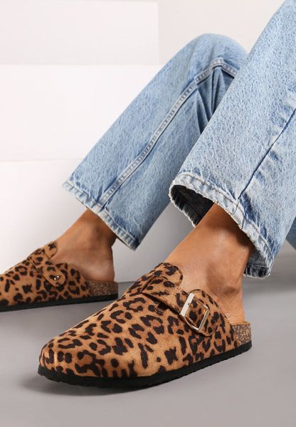 Brązowe Klapki w Panterkę na Korkowej Podeszwie z Ozdobnym Paskiem Keele