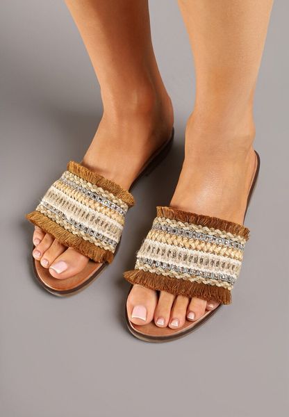 Brązowo-Beżowe Klapki w Stylu Boho z Frędzlami i Cyrkoniami Banissa