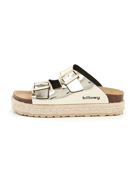 – zapięcie: sprzączka- noski: otwarte- powierzchnia: z metalicznym połyskiem- skórzana wkładka: ergonomicznie formowana- forma obcasa: platforma- podeszwa: antypoślizgowa
