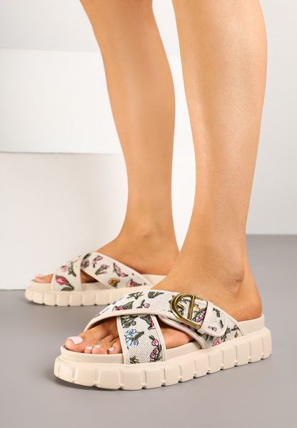 Beżowe Klapki na Grubej Tłoczonej Podeszwie w Kwiaty Dovelle