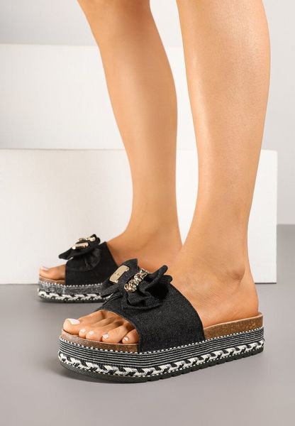 Czarne Klapki na Grubej Podeszwie Zdobione Kokardą z Metalicznymi Aplikacjami Tenalenea